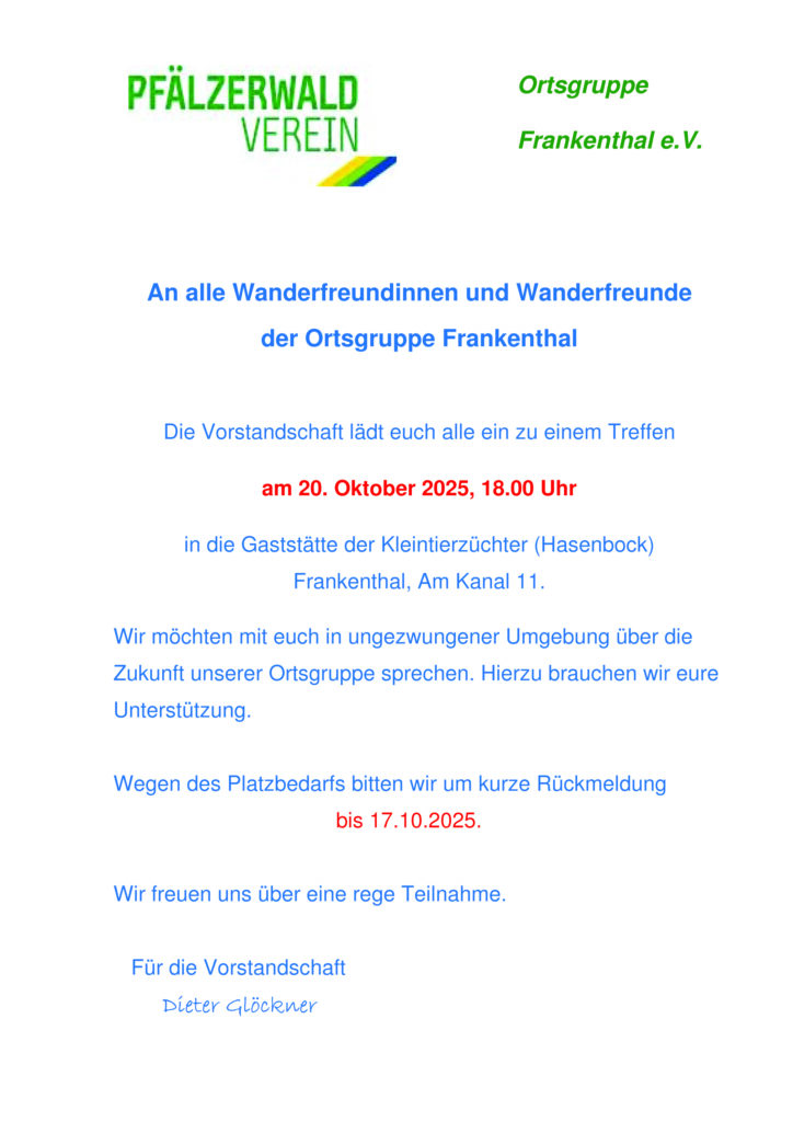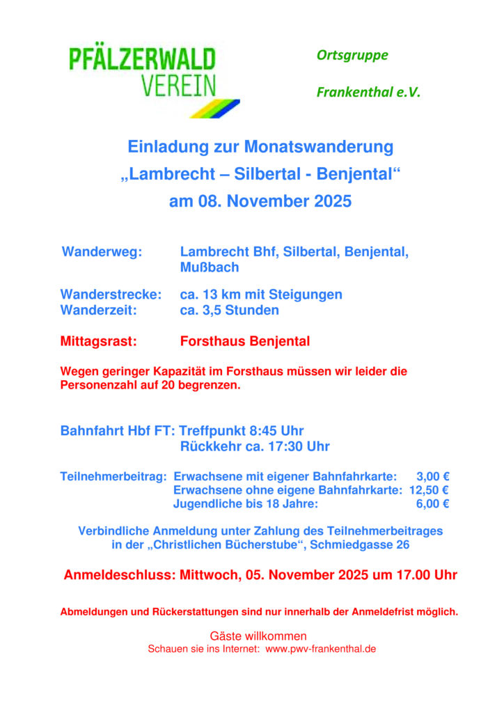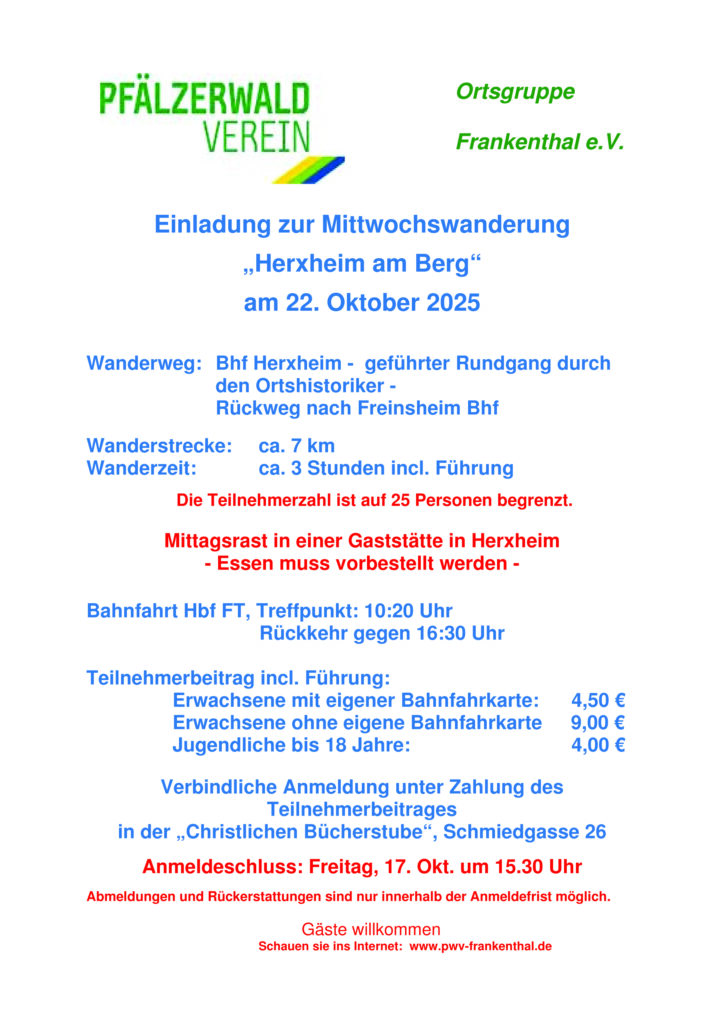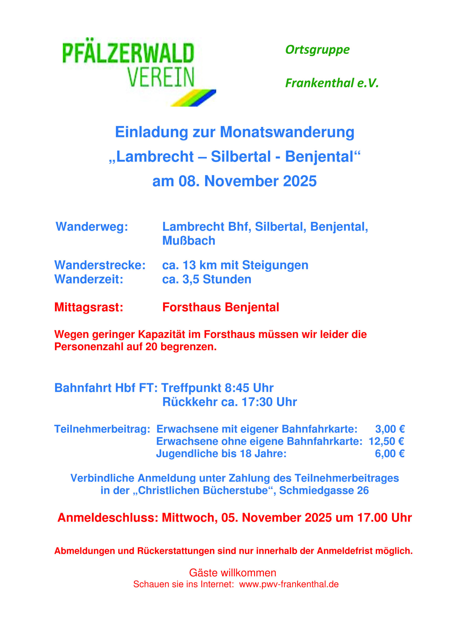 Aktuelles: 2025 1011 – Einladung zur Monatswanderung Wallberghütte am 11. Oktober 2025Herunterladen 2025 1022 – Einladung zur Mittwochswanderung Herxheim am Berg am 22.10Herunterladen 2025 1108 – Einladung zur Monatswanderung Lambrecht, Silbertal, Benjental am 08. NovHerunterladen 2025 1206 – Weihnachtsmarkt Maulbronn im Klosterhof KopieHerunterladen In unserem Schaukasten an der „Christlichen Bücherstube“ (Schmiedgasse 26), in der „RHEINPFALZ“, dem „WOCHENBLATT“ für Frankenthal sowie auf unserer Internetseite: www.pwv-frankenthal.de .