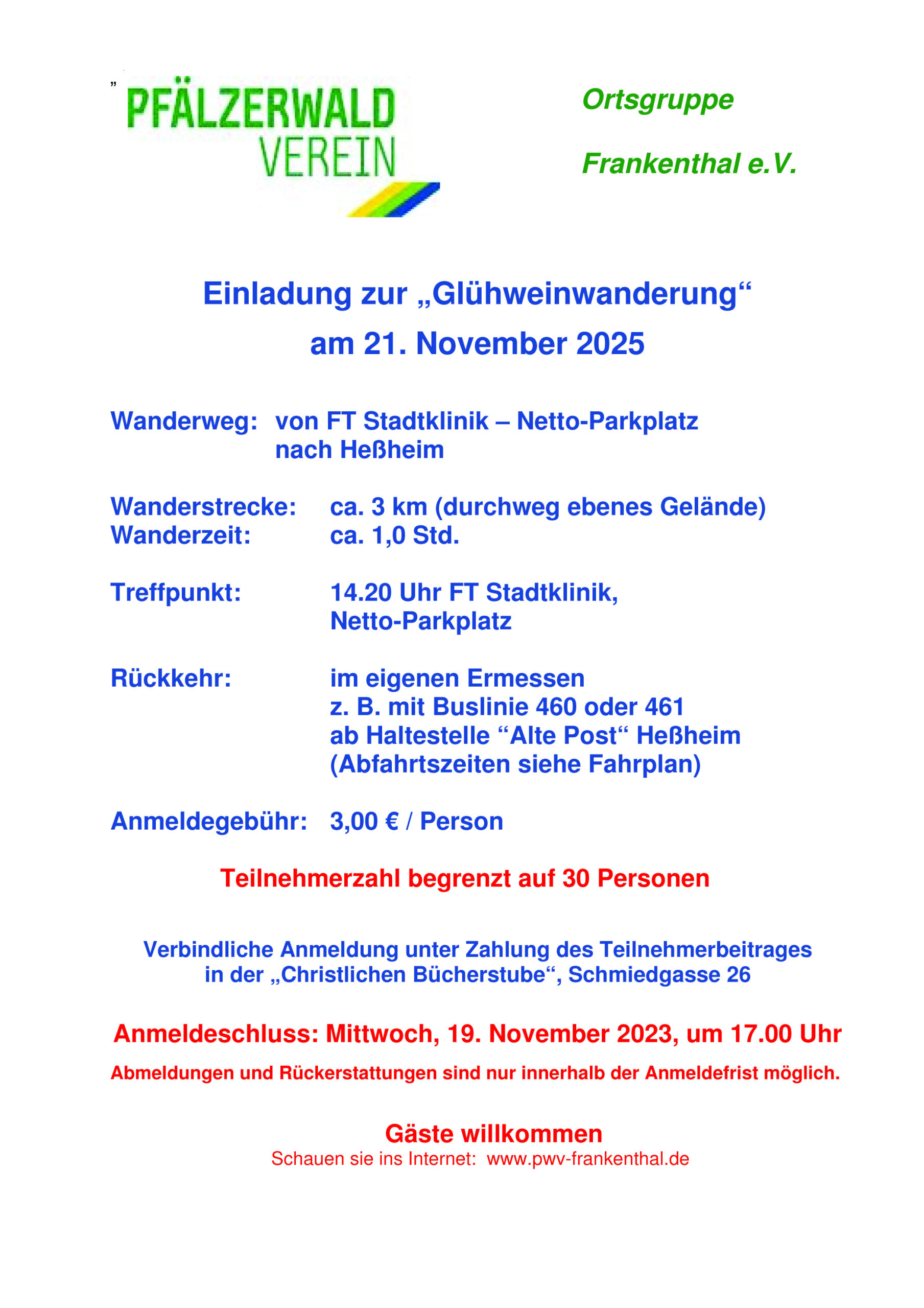 Aktuelles: 2025 1121- Einladung zur Glühweinwanderung am 21.11Herunterladen 2025 1206 – Weihnachtsmarkt Maulbronn im Klosterhof KopieHerunterladen In unserem Schaukasten an der „Christlichen Bücherstube“ (Schmiedgasse 26), in der „RHEINPFALZ“, dem „WOCHENBLATT“ für Frankenthal sowie auf unserer Internetseite: www.pwv-frankenthal.de .