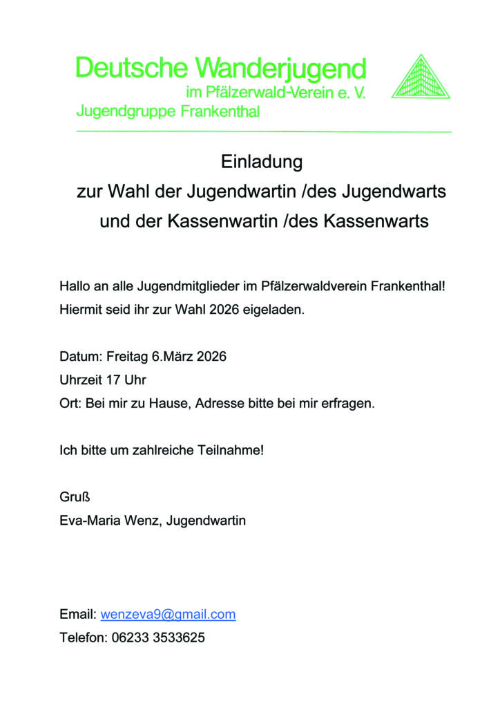 Aktuelles: 2026 0117 – Einladung zur Wanderung Start ins Wanderjahr 2026 KopieHerunterladen 2026 0000 – Einladung Wahl 2026 KopieHerunterladen In unserem Schaukasten an der „Christlichen Bücherstube“ (Schmiedgasse 26), in der „RHEINPFALZ“, dem „WOCHENBLATT“ für Frankenthal sowie auf unserer Internetseite: www.pwv-frankenthal.de .