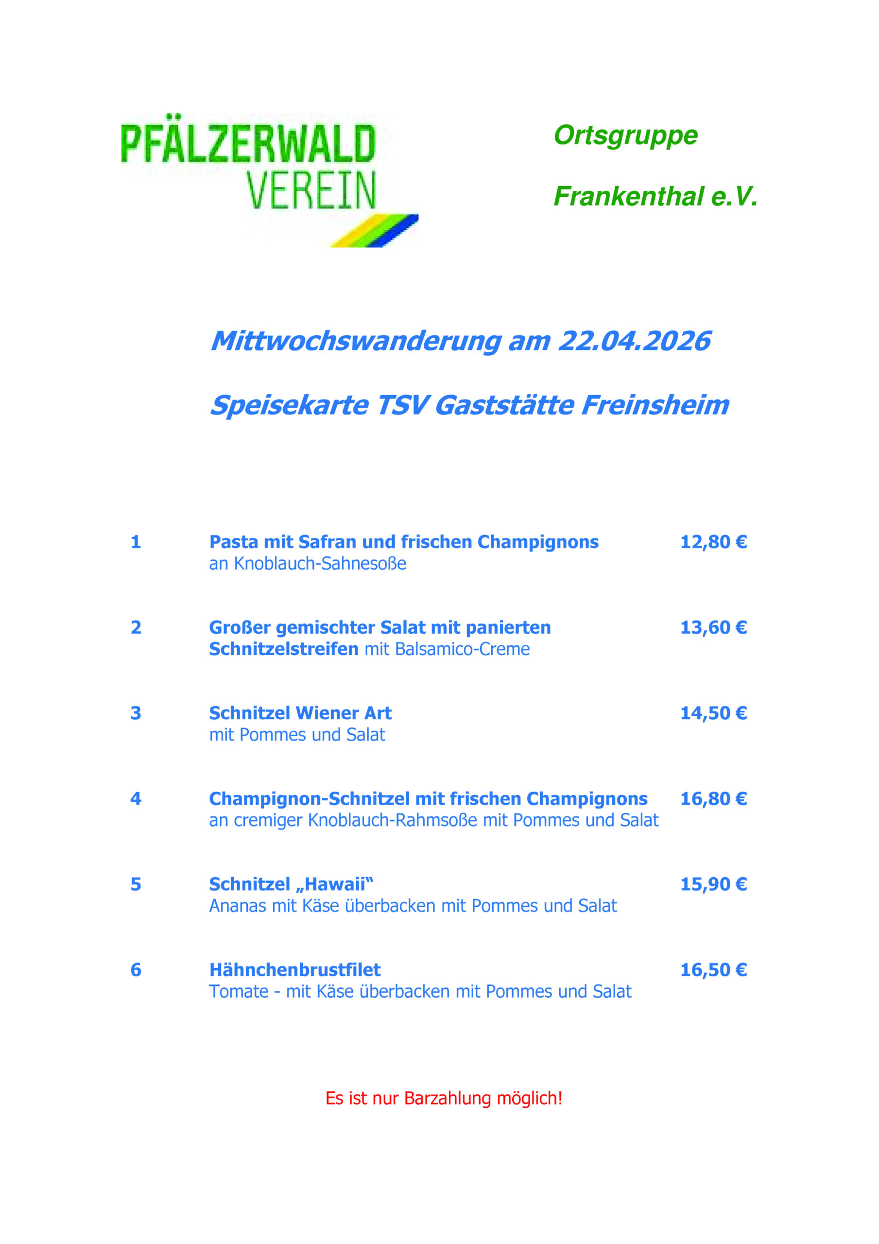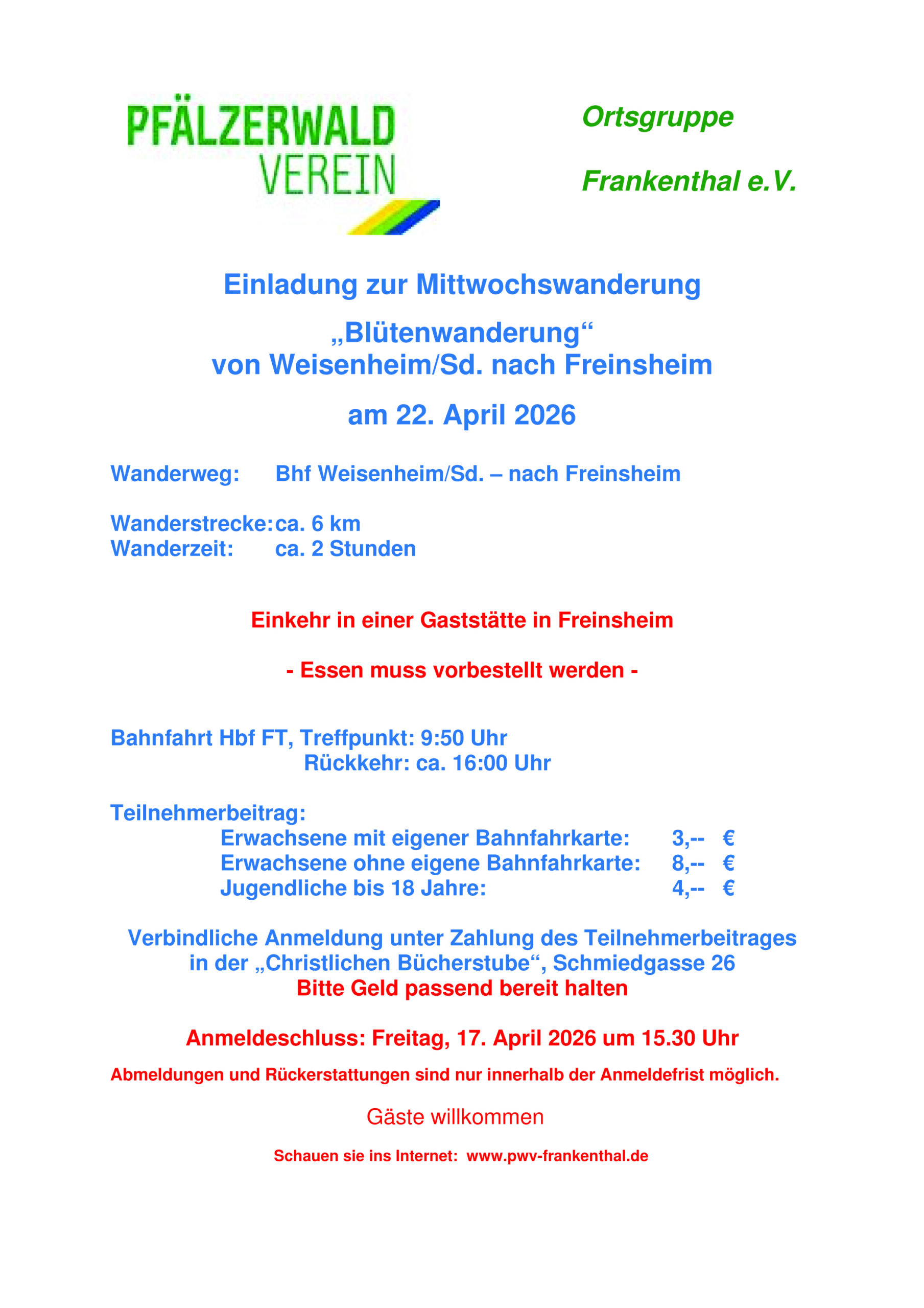 Aktuelles: 2026 0418 – Einladung zur Mitgliederversammlung KopieHerunterladen 2026 0422 – Einladung zur Mittwochswanderung Weisenheim-Freinsheim am 22.04Herunterladen 2026 0422 – Speiseplan zur Mittwochswanderung am 22.04.2026 FreinsheimHerunterladen In unserem Schaukasten an der „Christlichen Bücherstube“ (Schmiedgasse 26), in der „RHEINPFALZ“, dem „WOCHENBLATT“ für Frankenthal sowie auf unserer Internetseite: www.pwv-frankenthal.de .